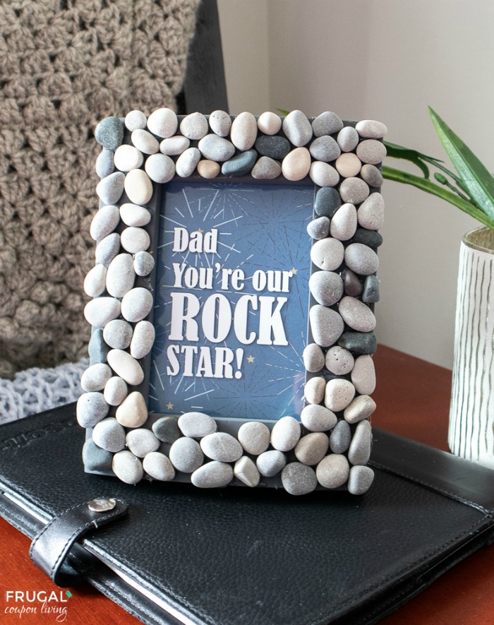 Looking for an easy and Frugal Father’s Day gift from home? This DIY Father’s Day Photo Frame is a cute gift idea from the kids. Download these five funny Father’s Day quotes and puns. Upload your FREE SVG Files for Cricut Design Space, print, and create a rock picture frame for a dad that is a rock or rock star!