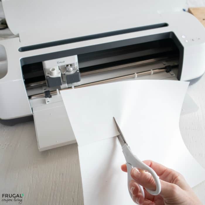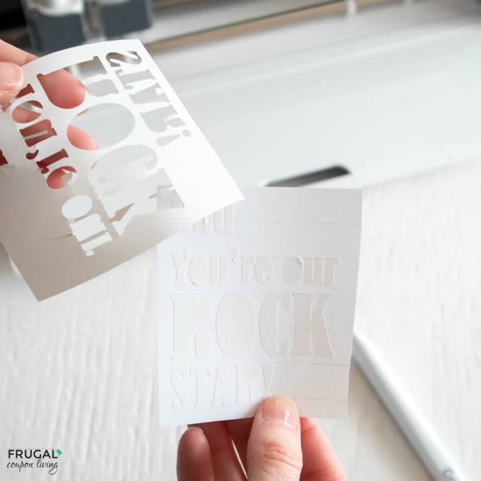 Using the weeding tool, peel away the excess vinyl around the cut phrase and discard excess vinyl.