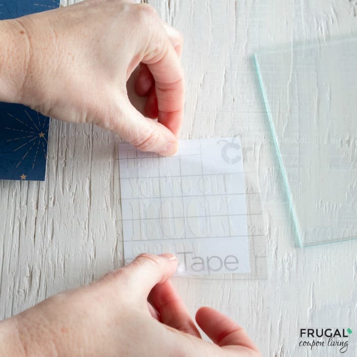 Peel away the vinyl backing, leaving just the phrase adhered to the transfer tape.