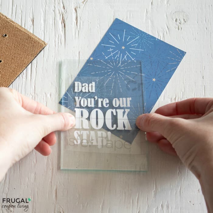 You have crafted your rock picture frame, cut your vinyl, and cut your card stock mat. Next you will begin to assemble your Father’s Day Rock Picture Frame.