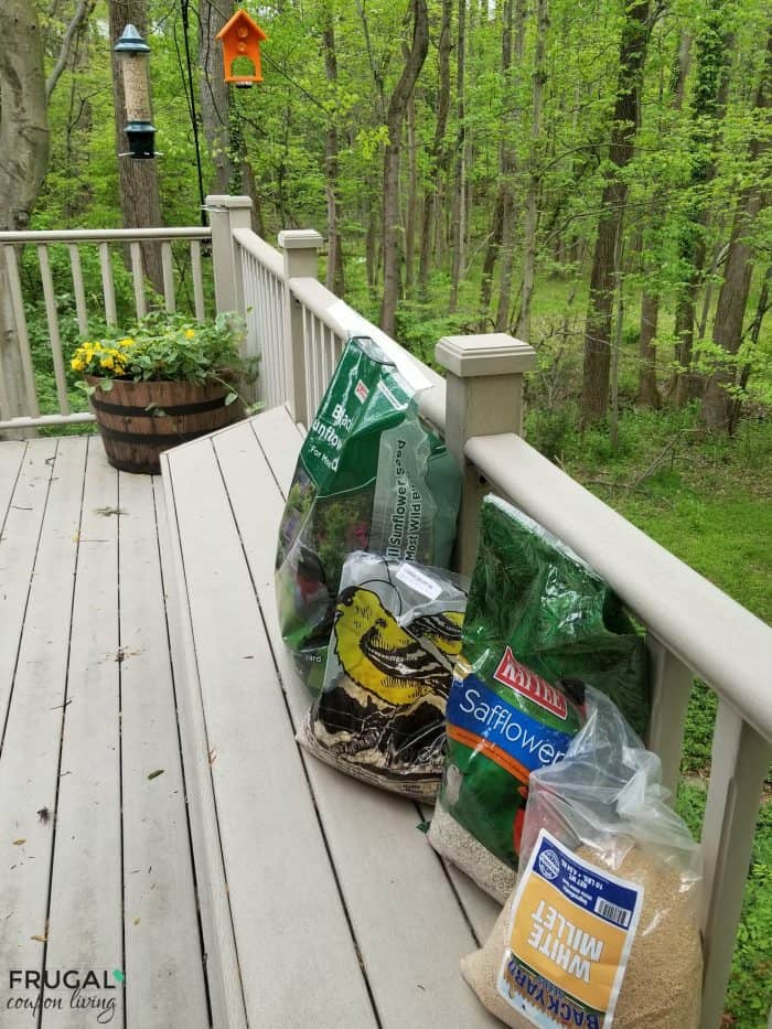It is best to store your bird seeds in a dry place that is secure from outside elements including heat and moisture like rain and snow. We store our bird seed in a Rust-Proof Steel Locking Lid Trash Can. I used to keep this on the deck, but the raccoons either found a way to get into it or if I was able to keep it locked, I felt it was just teasing them. Now I keep it inside our home by the back door (out of racoon view!)