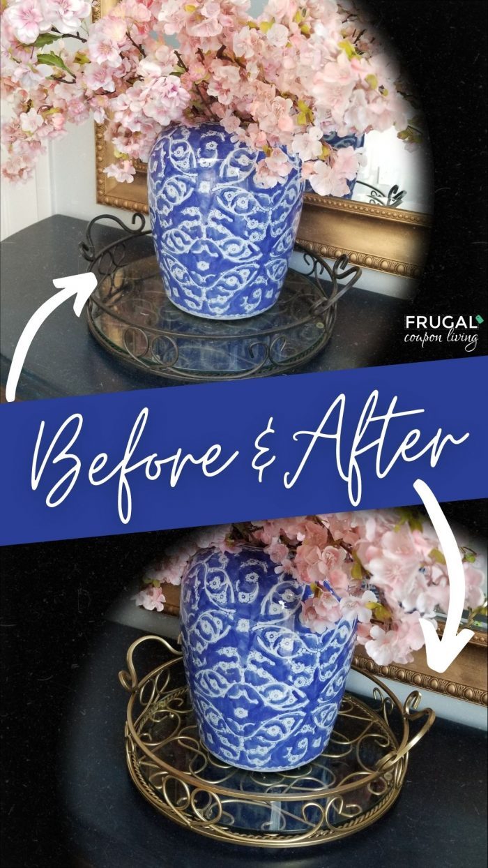 Do you have five dollars? Do you have five minutes? Make a list of all the products in your home you don’t use because they are the wrong color! Take a look at my upcycled serving tray and gold spray paint improvement.