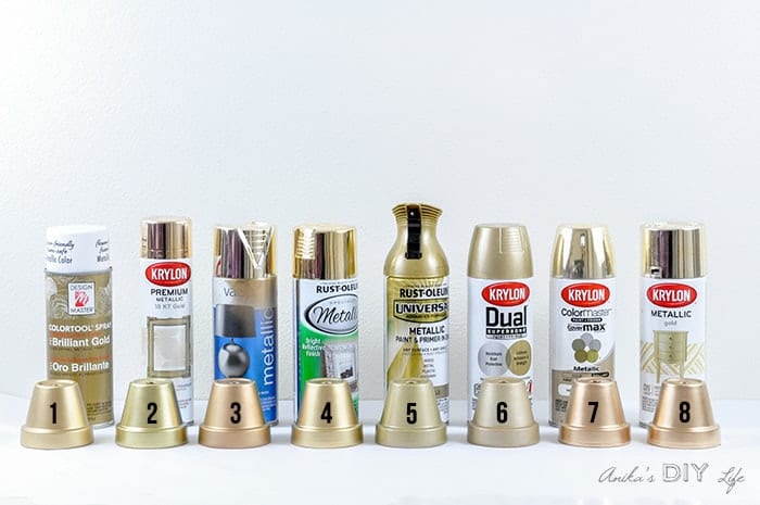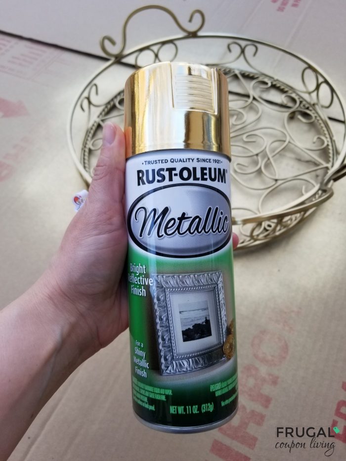 Anika does a really good job of showing you close pictures of spray painted terracotta pots so you can compare the different hues of gold spray paint. From her gold spray paint review, I settled with the best gold spray paint color for the tray – Rust-Oleum Spray Paint in Metallic Gold for a rich, super glossy metallic finish.