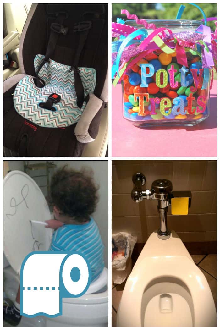When traveling, you can use a diaper. Keep a cheap potty chair in your car along with a few diapers. If your child needs to go to the bathroom, open a diaper and put in the bottom of the potty chair. When he is done, wrap up the diaper and done. No mess. | A Haven of Chaos