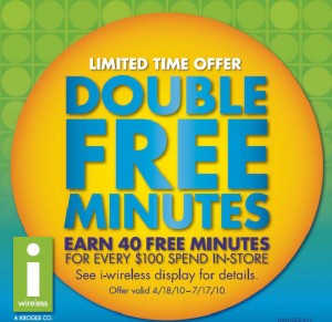 Currently if you are a new Kroger i-wireless customer, you can earn Double FREE minutes. Activate an i-wireless phone now through July 17, 2010 and earn DOUBLE the FREE minutes for your first 60 days of service. Earn FREE airtime when you shop at participating Kroger-owned stores. In fact for each $100 you spend in-store, you’ll earn 40 FREE minutes (normally 20) of airtime.
