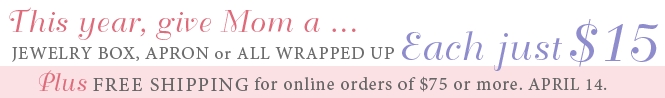 Head to Vera Bradley Today Only for an awesome sale on Aprons, Jewelry Boxes and All-Wrapped-Up Jewelry Rolls – $15 each! Shipping adds about $7-8 but the items come nicely wrapped and ready for gift-giving. Spend $75 or more and get FREE Shipping – Consider combining sales with a friend or family member!