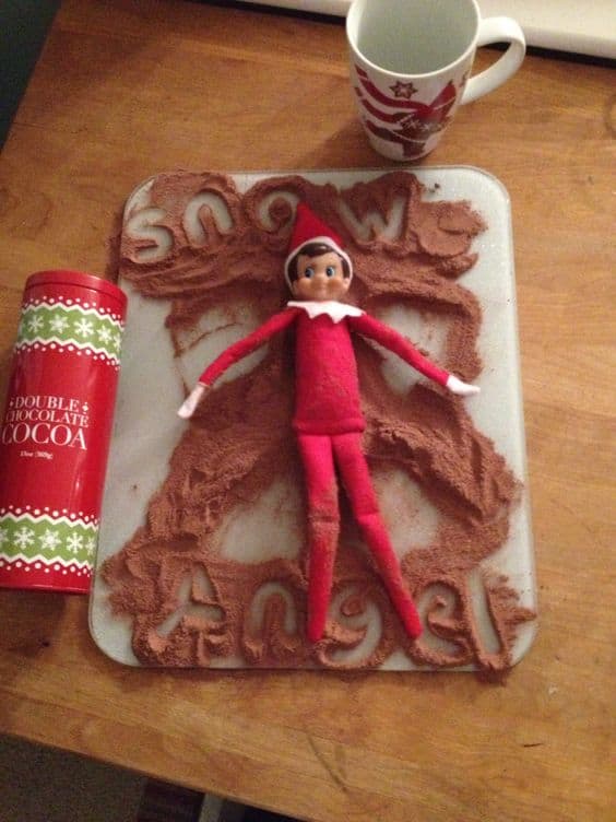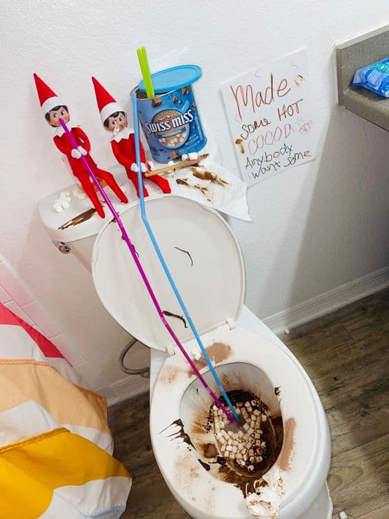 Injecting a whimsical touch into the morning routine, the mischievous helper has embarked on a creative escapade by drawing three charming snowmen on the bathroom mirror using shaving cream! In a burst of festive inspiration, Santa’s helper has transformed the mundane mirror into a canvas of snowy delight. The white shaving cream serves as the perfect medium, allowing the little guy to craft each snowman with a delightful flair. These impromptu snowy companions greet anyone entering the bathroom with an unexpected burst of holiday cheer. This lighthearted and imaginative Scout Elf idea is not only simple to execute but promises to bring a gleeful surprise to the start of each day during the festive season.