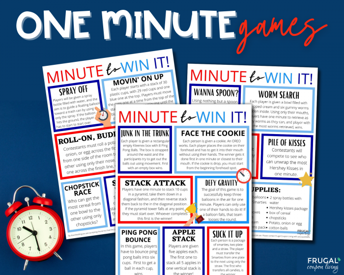 Yan see the entire list of these games in the Frugal Coupon Living shop, just look under the seasonal Minute to Win it Games Ideas Tab!