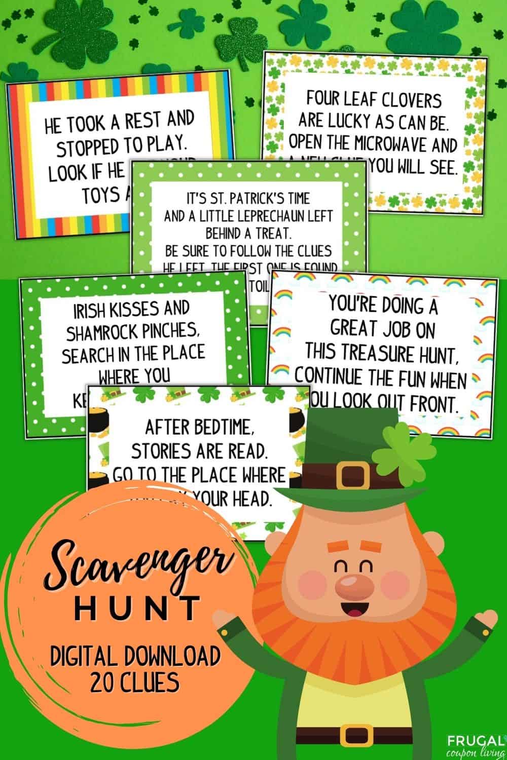 First, have fun trapping a leprechaun. Or even without a trap, you can still enjoy this St. Patrick’s Day Scavenger Hunt with 20 rhyming clue cards. If this is paired with the visit of a small gree fellow, leave behind the first clue for your child to find. Pin to Pinterest.