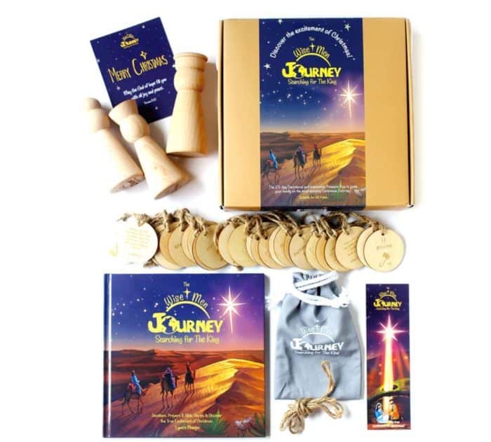 The Wise Men Journey is a Biblical Christmas devotional. Go on a journey with the three wise men as they search for Baby Jesus. Similar to a 25-day advent calendar, enjoy reading a Christmas devotional storybook that daily reveals the authentic Christmas story. Follow three wooden Wise Men and hang 25 wooden ornaments daily on your Christmas tree. Your family will go on a Christmas adventure and celebrate the first Christmas in a whole new way!