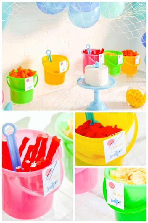 When setting the table, download these free Baby Shark Food Labels including Tentacles (Twizzlers), Coral (Cheeto Puffs), Minnows (Swedish Fish aka Gummy Sharks), Seashells (chips), Driftwood (pretzels) and more. They are cute snack and make adorable Shark Party Food as well as easy baby sharked theme party table decorations. | Kara at Fun365