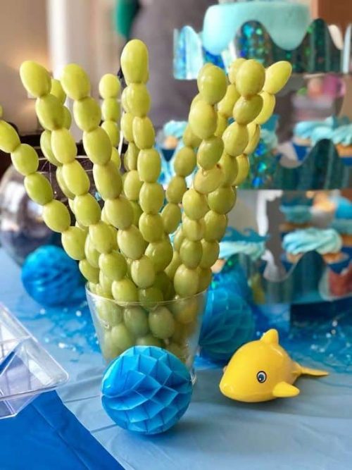 Stay with beach themed food. You can find many of our beach inspired party recipes, but also add these seaweed grapes kabobs. | Catch My Party
