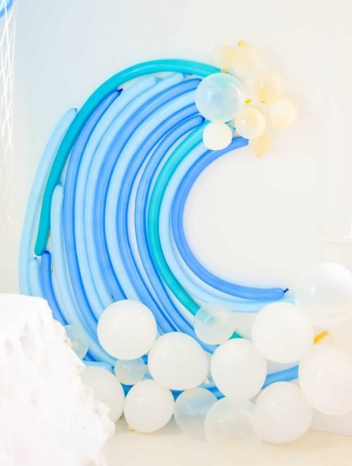 Learn how to make the most amazing DIY party balloon backdrop for a fun twist on party decor. This ocean wave balloon backdrop, would be a hit for photos. Best of all, no helium involved in this balloon garland display. You just need a little imagination. In keeping with the theme, you could also add these Baby Shark Wall Decals. They would be the perfect touch to a photo booth. | Kara at Fun365