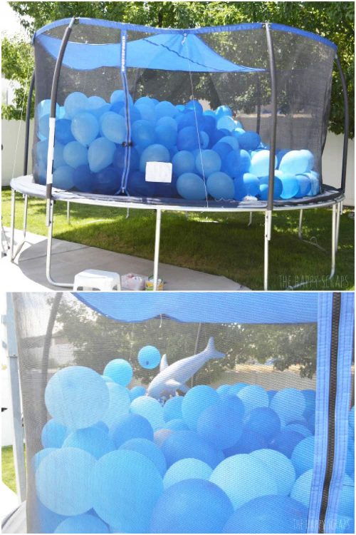Have a trampoline? Create your very own DIY Shark Tank in the backyard. This Balloon Filled Trampoline Shark Tank will be a huge activity and hit for the kids. Add a bubble maker to have fun bubble in the backyard while you play. Exhaust them before lunch! | The Happy Scraps
