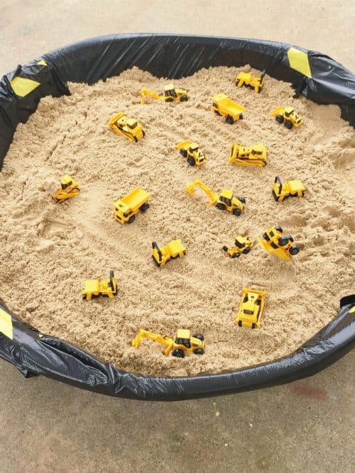 Give everyone an activity to keep them busy. Wrap a kid’s swimming pool with black trash bags, fill with play sand and mini construction vehicles. | Fab Everyday