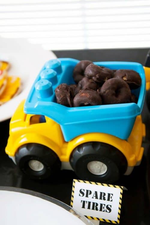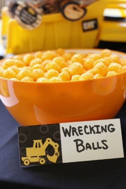 You might have orange fingers after you dig into these wrecking balls! You can put other snacks in hard hats for a cute Construction Tablescape for your eats. | Moms and Munchkins