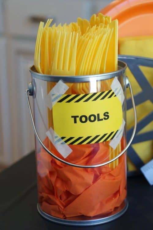 Label your tools! SNL Parties used clear paint cans and yellow plastic utenils.| SNL Parties