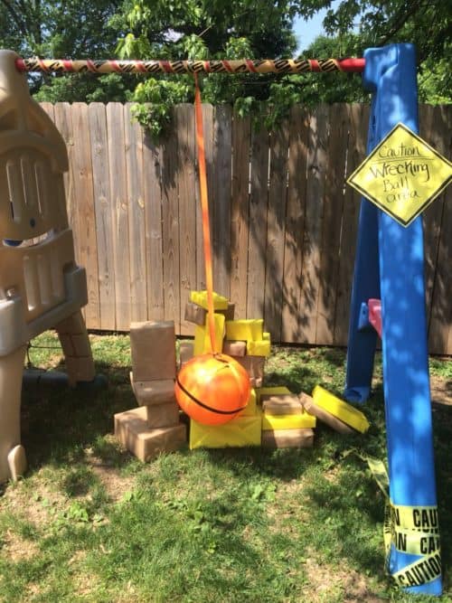 Speaking of wrecking balls, turn a swing set into a wrecking ball area for play! You can wrap old shipping boxes with kraft paper and line them with black sharpie markers to make them look like bricks! | Source Unknown.