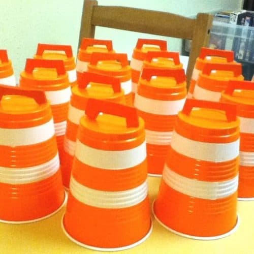 Orange Solo Cups and white electrical tape make cute construction cones for the table. | Source Unknown