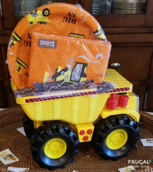 I have to give my 10 year old daughter credit for our dig in construction napkins and plates display. She used clip art to decorate the table and make the dump truck look like there was dirt inside.