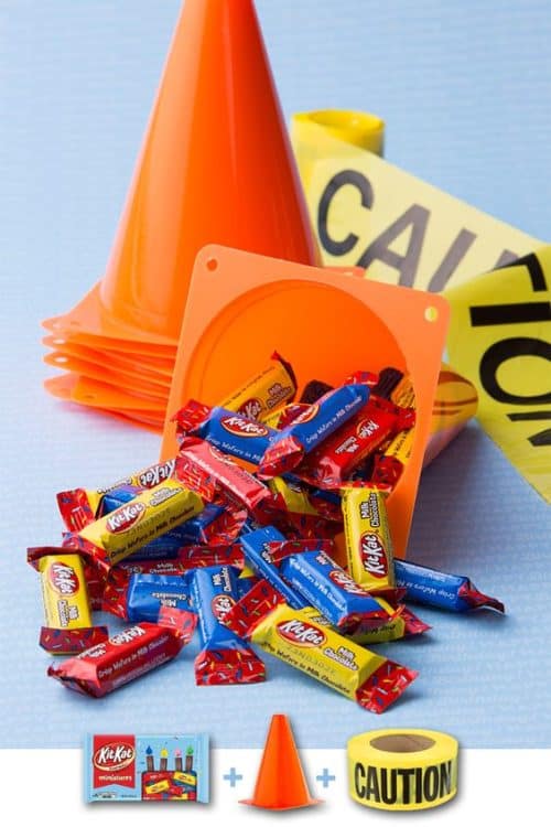 Construction Goodie bags can be made with candy and plastic orange cones! Pair with these construction party favor gift tags. | Hersheys