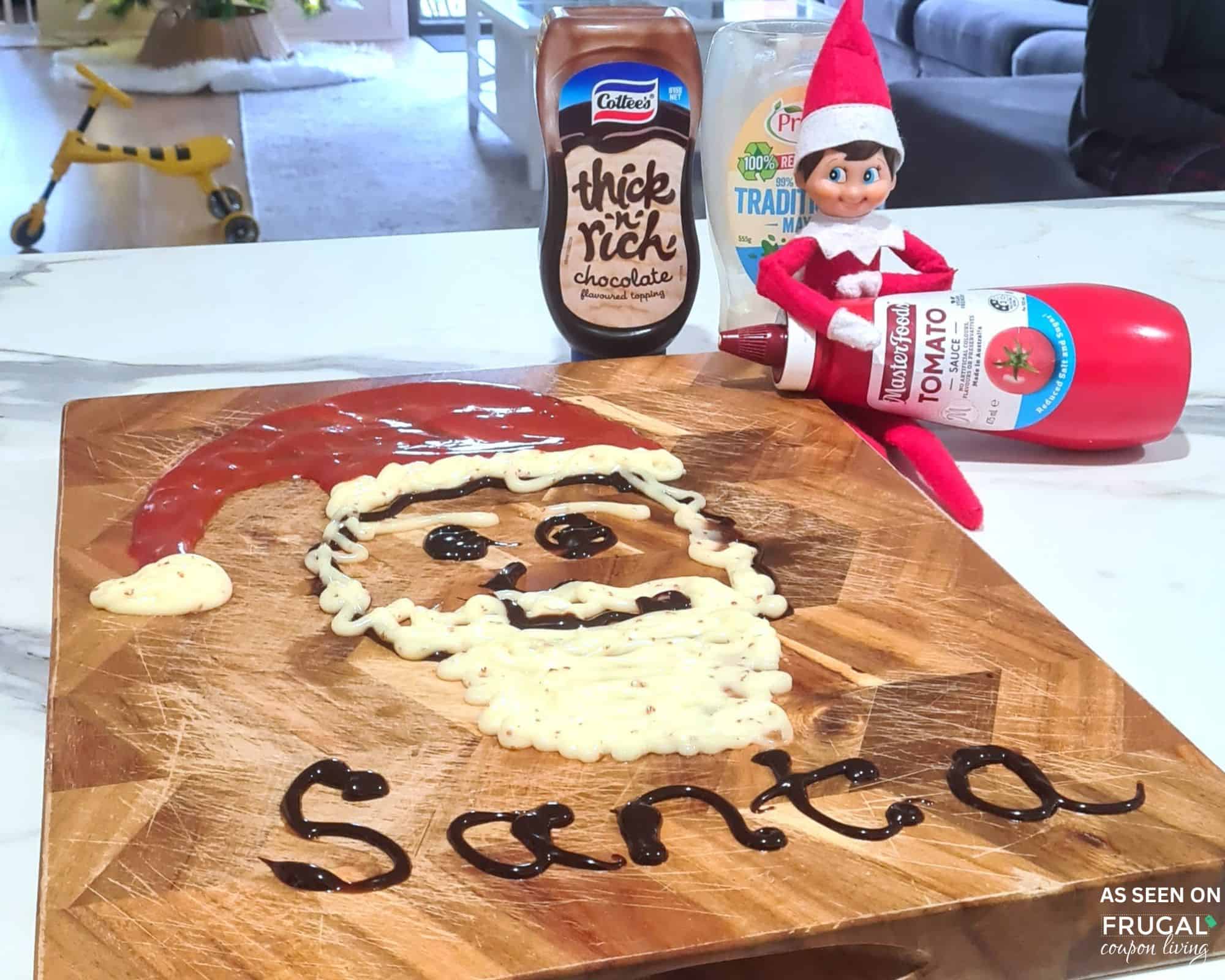 - Finally, place your family elf nearby as if he’s been busy drawing Santa with condiments from the fridge!