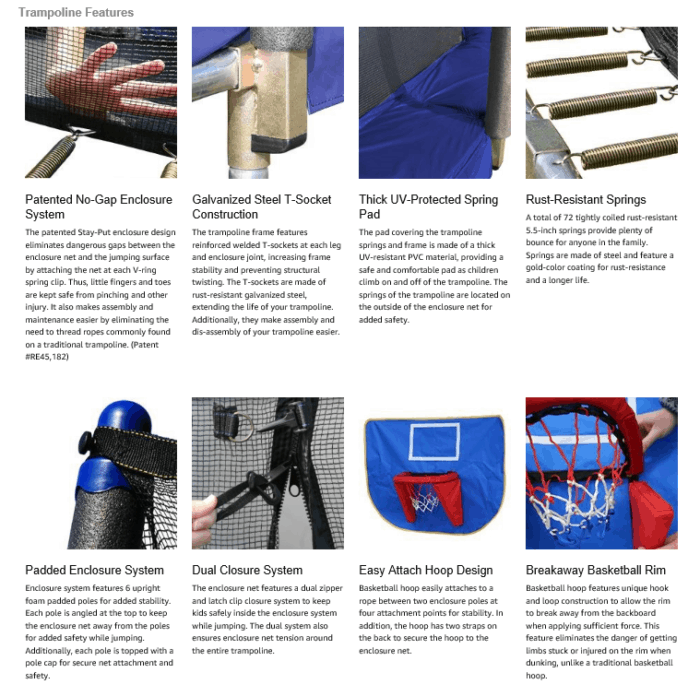 • Patented no-gap enclosure System attaches net to jump mat at each spring, eliminating gaps