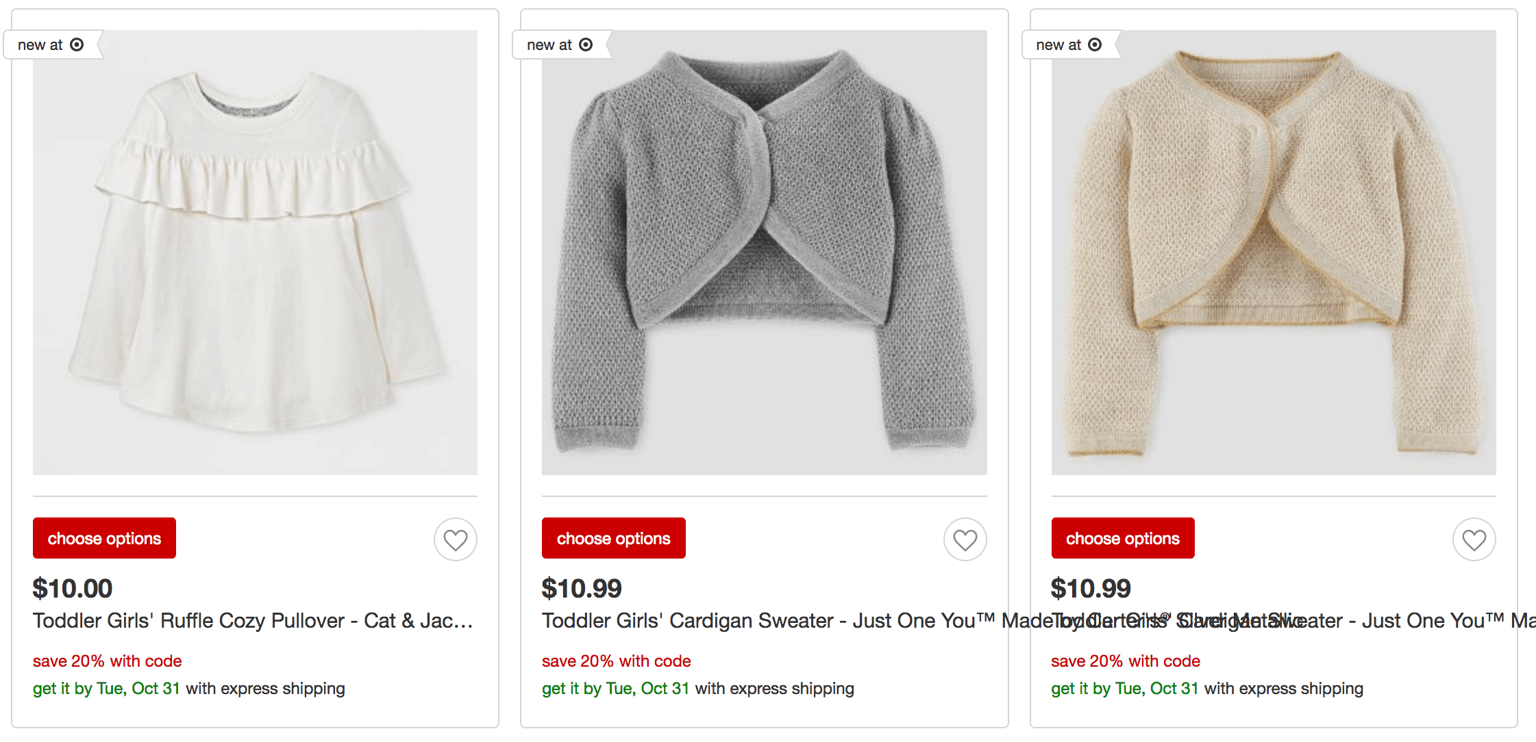 Through the end of today 10/28, Target offers 20% off select Men’s, Women’s and Kids’ sweaters. Just enter coupon code COZY at Checkout to receive discount.  It’s getting cold outside, stay warm with this deal.  This sale also applies to select Cat & Jack girl cardigans.  Prices start at just $10.99 or $8.80 after coupon code.