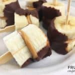 - Hold the skewered banana bite, dip the side into the chocolate, place onto a piece of parchment paper, and into the freezer.