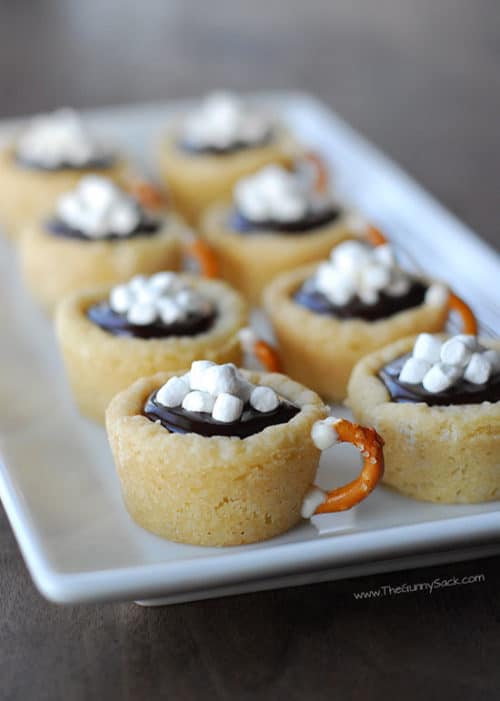 These Hot Chocolate Cookie Cups made with sugar cookie dough are filled with hot chocolate ganache, have a pretzel handle and mini marshmallows on top! | The Gunny Sack