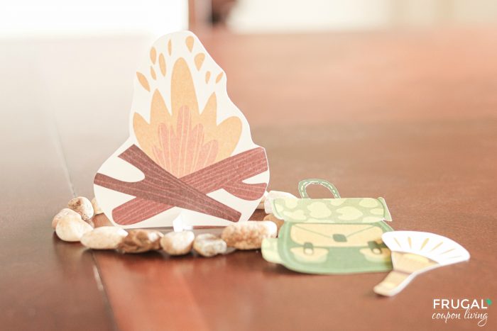 Staging 3-D Tip: For the campfire (and the reindeer), I created a little perpendicular base by cutting a strip, cutting a tiny slit in the middle of it, cutting a tiny slit in the bottom of the reindeer and the fire cutouts, then fitting the slits together in a perpendicular way. This way I could stand them up and make them more 3D.