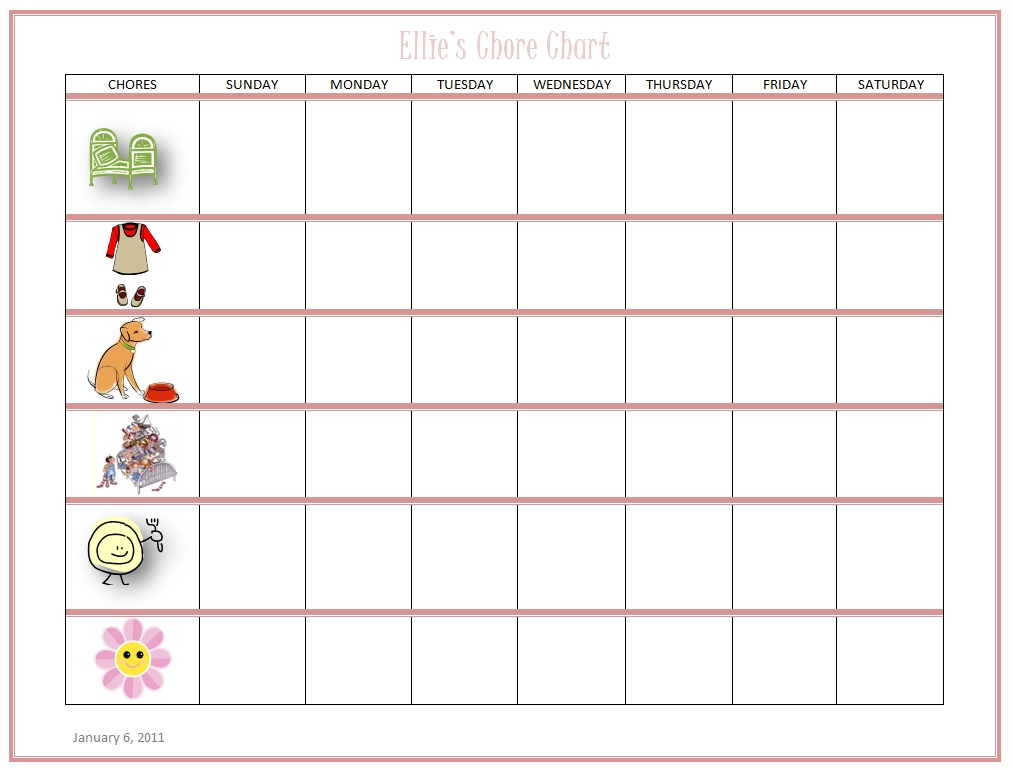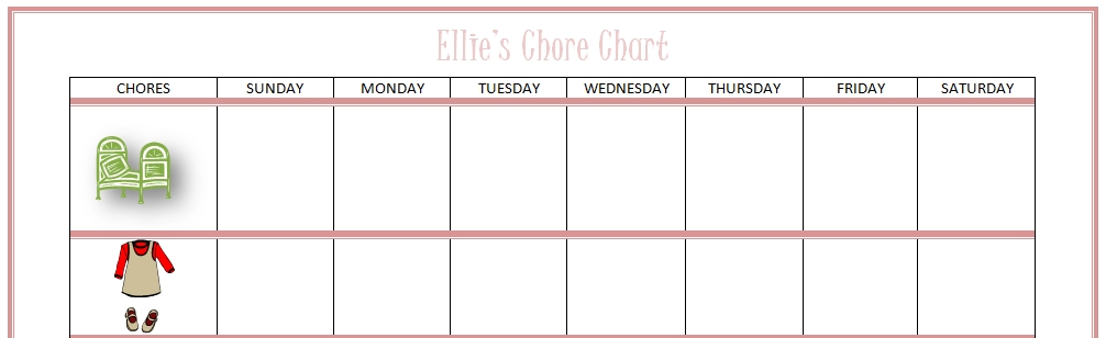 We have not started chores quite yet as my oldest is not quite three; but my friend put together her own chart that she updates from time to time as her children grow or ‘master’ certain chores. It is a word document using a table and clip art to represent the chore along with the days of the week. She prints it and gets it laminated at FedEx/Kinkos (or anywhere else that does laminating), punches a couple of holes in the top for a ribbon loop and hangs it on the bulletin board. Using a dry-erase marker, she then checks off chores as they’re completed each day!
