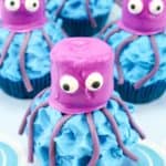 We have quick and easy giant squid cupcakes for your next beach party. Eight adorable legs, two giant eyes, and a fluffy head make this octopus dessert one easy food craft for the kids.