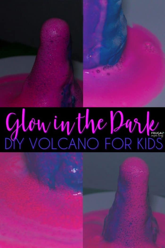 Our Glowing Volcano Science Experiment is much easier than you think using common ingredients found in your household. Can you guess the lava ingredients? #FrugalCouponLiving #Volcano #ScienceExperimentDid you know? Once you’re done oohing and awing over the glowing volcano, talk a little about the reaction making the volcano erupt. The reaction between the vinegar (dilute acetic acid) and baking soda (sodium bicarbonate) generates carbon dioxide gas. It’s the carbon dioxide releasing from the chemical reaction that causes the volcano to fizz, and when you add dish soap, the bubbles stick around just a bit longer! The ingredients from the highlighter marker react with the light, causing the volcano to glow.