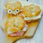 Now take your eye toothpicks and poke two into each ham and cheese croissant sandwich. You will want to place the toothpicks at an angle so your candy eyes are are laying back. Less chance of the candy eyes moving!