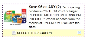 Make sure to print the $6/2 Zyrtec, Pepcid, MOTRIN, or MORTRIN PM coupon. You will also be able to get this same coupon in the Smart Source Insert on Sunday 1/9.