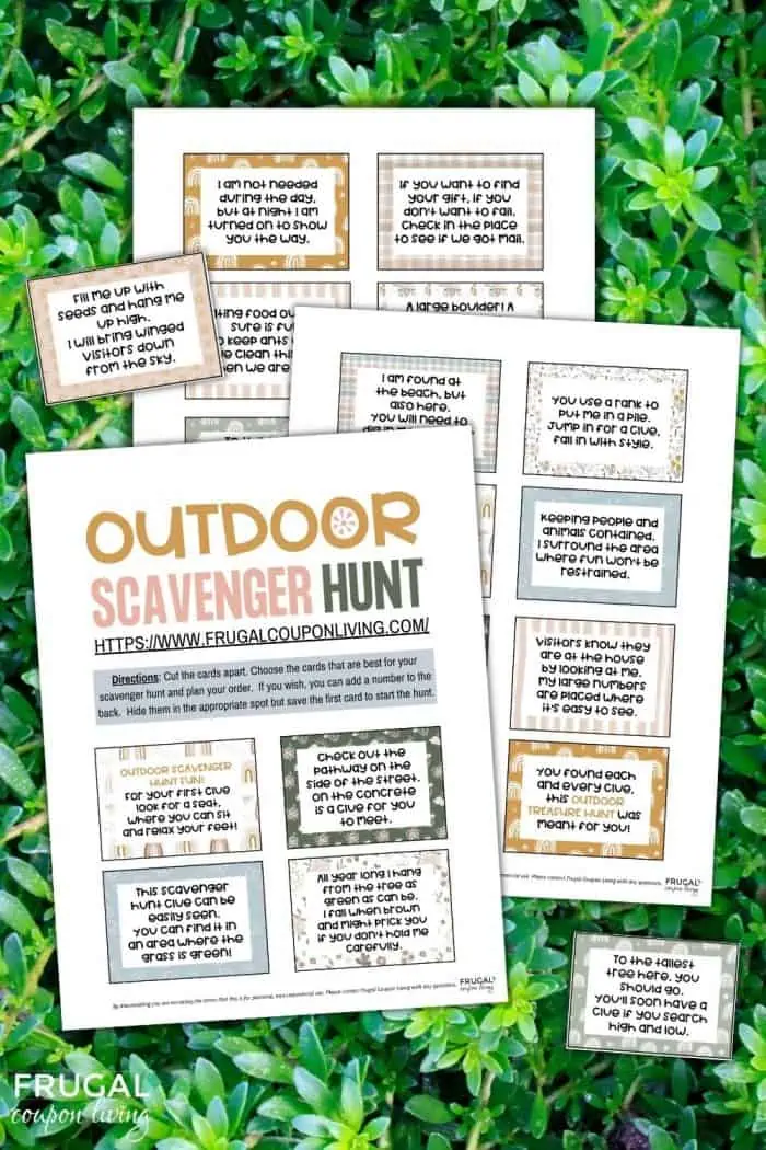 - Printable backyard outdoor scavenger hunt clues (download below)
