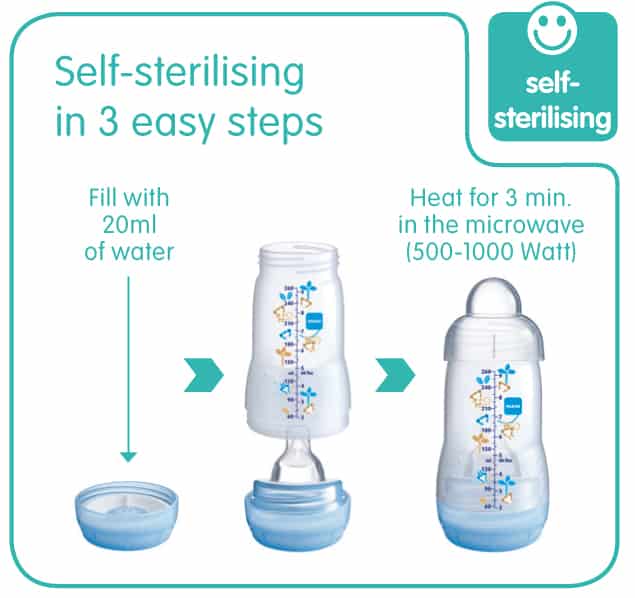 Did you know!? Bottles can be self-sterilized in the microwave. Follow these 3 easy steps. Fill the base with 20 ml of water. Lay the nipple and nipple ring in the base of the bottle. Place the bottle on top followed by the cap and heat in the microwave for 3 minutes!