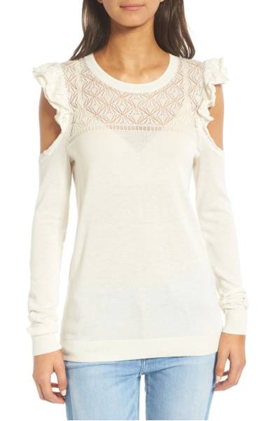 Cold shoulder tops are also really popular right now, and I just adore this Hinge Ruffle Cold Shoulder Sweater, which is on sale for $45.90 (reg. $69).