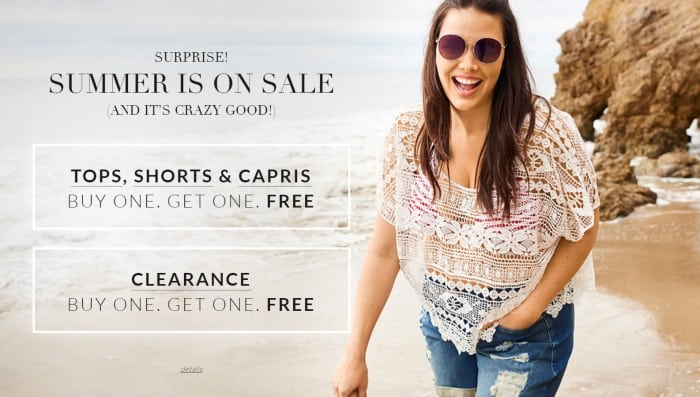 It’s time for a huge summer sale from Lane Bryant! Right now get buy one get one free Top, Shorts, and Capris. Plus you get that same offer on the clearance section. The price of clearance items starts at just $9.99 for tops. So grab two for that very low price. Or get two pairs of shorts for $19.98. You can choose to pick your item in store to save on shipping.