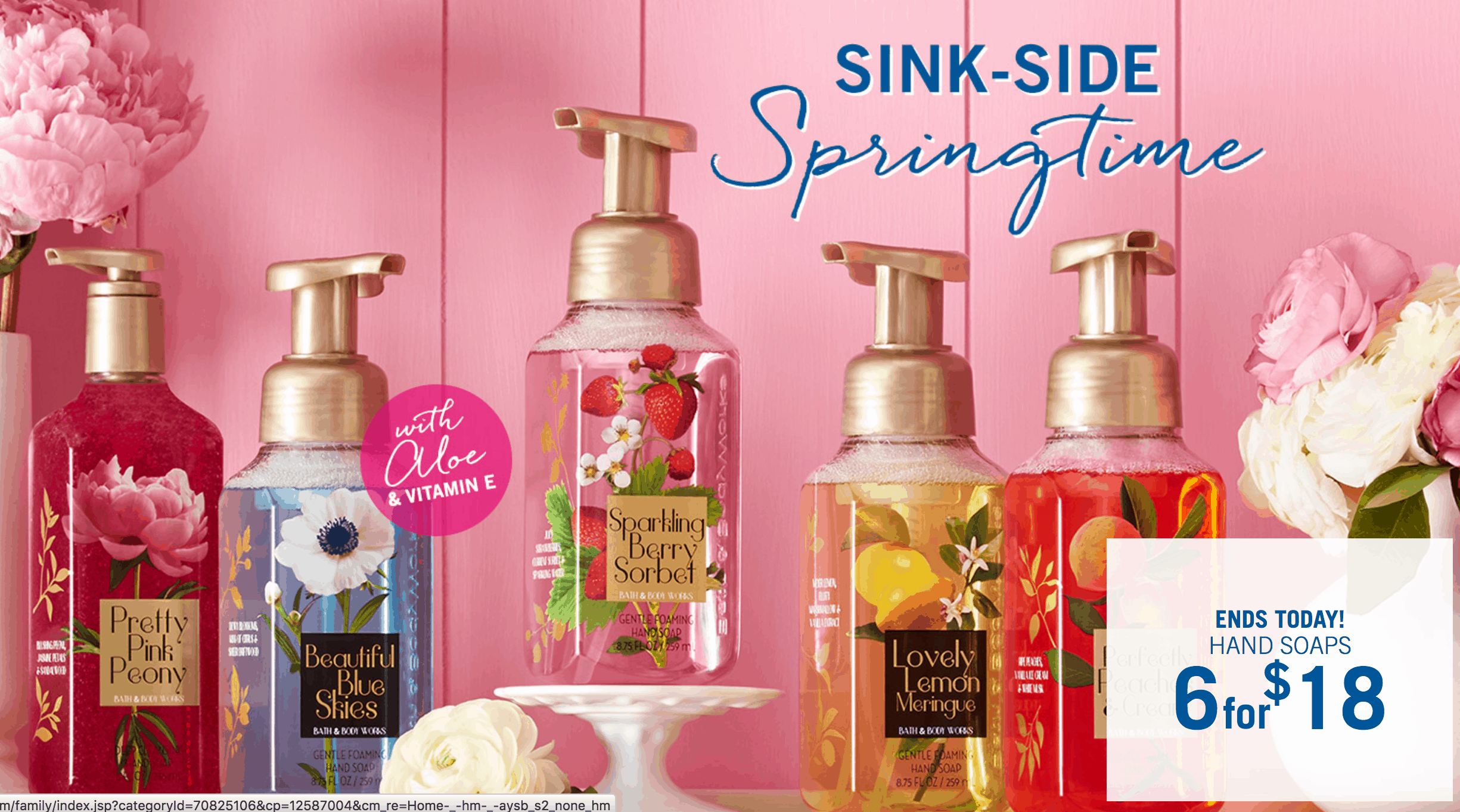 Through the end of today, 2/23, Bath & Body Works has Gentle Foaming Hand Soaps and Deep Cleansing Hand Soaps on sale 6/$18. That makes each just $3! On top of that you can get an additional 20% off your order with promo code S175370 at checkout. Conversely, you can get $10 off a $30+ purchase with the code GOODIES. You can only choose one code at checkout so choose the one that fits your needs best. Here is a way to use one of these codes:
