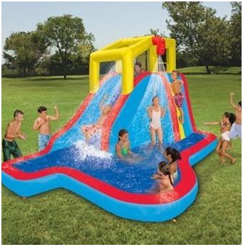 - Includes: inflatable water slide, blower motor, water spraying hose assembly, 3 blower stakes, 7 bouncer stakes, carrying bag, 2 water bags & 4 repair patches