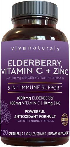 These 5 in 1 Daily Immune Support Vitamins include Elderberry, Vitamin C, Zinc, Vitamin D and Ginger. The Sambucus Elderberry and Ginger help provide antioxidant support, Zinc Oxide helps to promote immune function, and Vitamin D and Vitamin C give an extra immune boost.