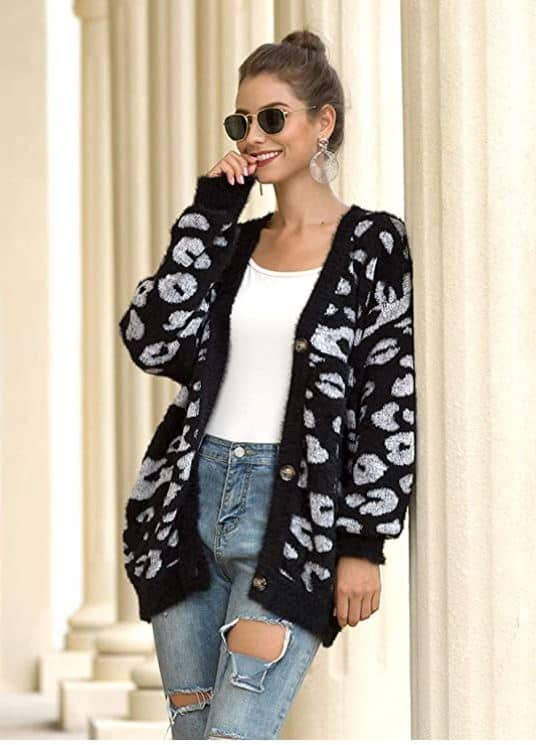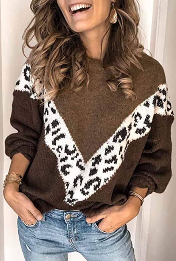 I love the contrast between the brown background, the white “V” and the leopard print pattern. It looks super cozy – perfect for winter – and is just what you need to throw on with your favorite pair of jeans and Converse or boots.