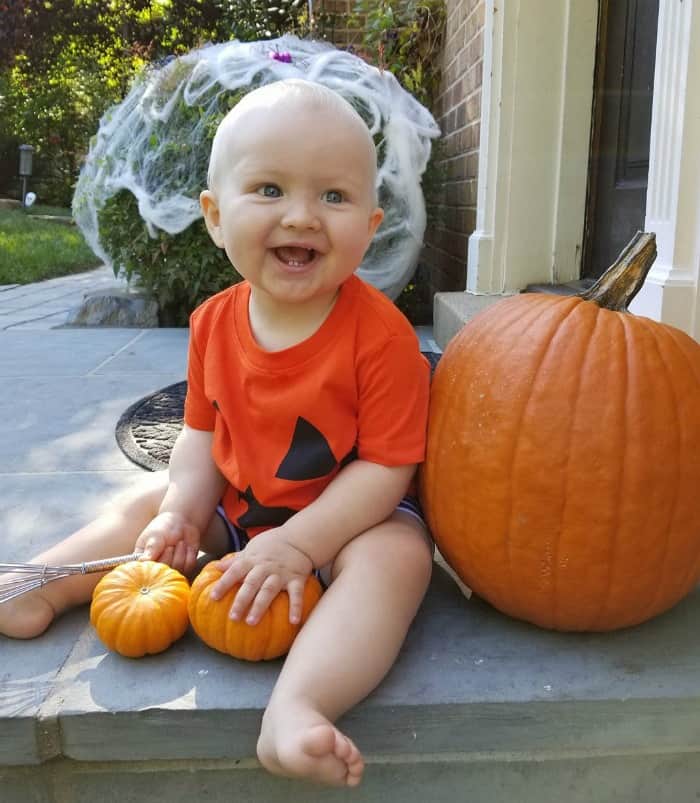 … and of course after this picture was taken, I was chasing this little pumpkin through the yard – my big belly bump and all!