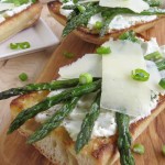 - Spread the goat cheese mixture on each piece of bread, followed by 4-6 asparagus pieces, 2-3 pieces of shaved Parmesan and a sprinkling of green onion.