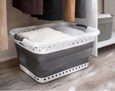 I need this laundry basket in my life because it collapses for easy out of the way storage. Get this White and Gray Collapsible Plastic and Rubber Laundry Basket for $12.98.