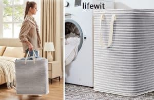 Are you plagued by the dirty clothes scattered on the coat rack, the sofa, and bathroom door in daily life? Simply stretch these Lifewit Large Collapsible Laundry Baskets out, they will stand up and keep upright on their own! They can be easily folded up to save space when not in use. Made of well-constructed, collapsible thick terylene cotton fabric with rigid iron wire sewn into the top edges. The PE coating to keep stored items dry. Equipped with extended handles, the collapsible laundry basket can be easily carried by a single hand. even up and down stairs. Moreover, handles are reinforced with tight and precise stitching to prevent from tearing. These are ideal for laundry room, bedroom, bathroom, kid’s room and more! Each basket measures 15.7 x 11.8 x 23.6 inches.
