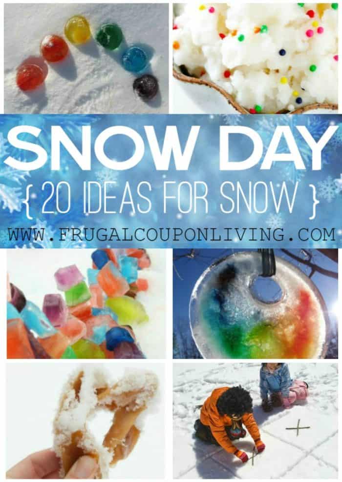 We recently moved from Florida to the DC area and snow is new to us. Other than building the snowmen, making a snow angel and sledding down a hill, I wanted to find alternative ways for my kids to have fun in this odd, little white substance. Take a look at these 20 Uses for Snow to have a list of Snow Day Ideas on your next school day off!