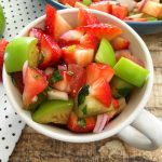 The summer weather has hit and we are feeling the temperatures. In in effort to find the perfect summer salad, I wanted to share with you this delicious recipe. Blended with strawberries, watermelon, onions, tomatillos, olive oil, vinegar and mint, this salad is the perfect about of sweet, crunch and flavor! We think you will love it as much as our family!